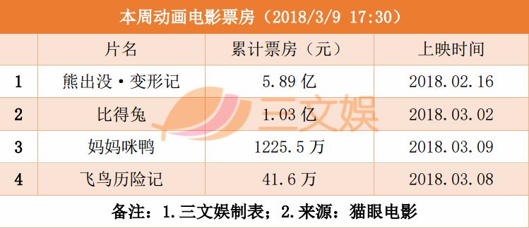 上映刚到一周的《比得兔》的累积票房也过亿,表现良好。
