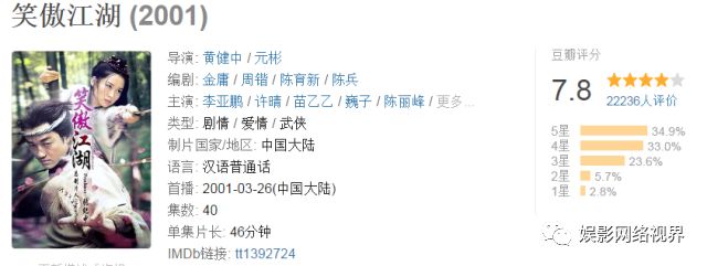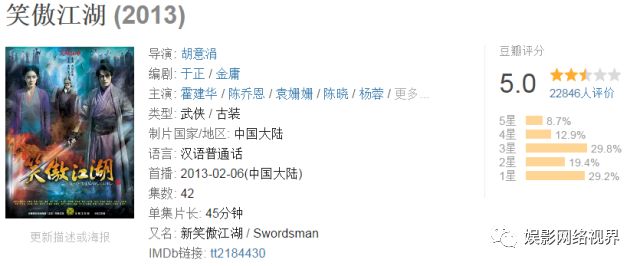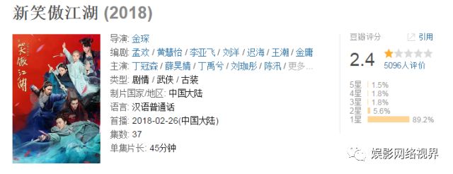 此次《新笑傲江湖》大胆启用新人,没有用任何的当红艺人、小鲜肉、小鲜花来做流量担当。这并不是武侠剧的第一次尝试,最近的一次还是去年播出后大获成功的新版《射雕英雄传》。据说此剧的回报率是百分之百,制作精良,还原度高,最主要的是演员颜值在线,人物形象贴切,最终收获了很不错的口碑。豆瓣评分达到了7.9,比李亚鹏、胡歌版的评分都高。而《新笑傲江湖》启用新人主演,却没想到遭到如此重挫,一上线,豆瓣评分直跌到2.4分,堪称史上最低!