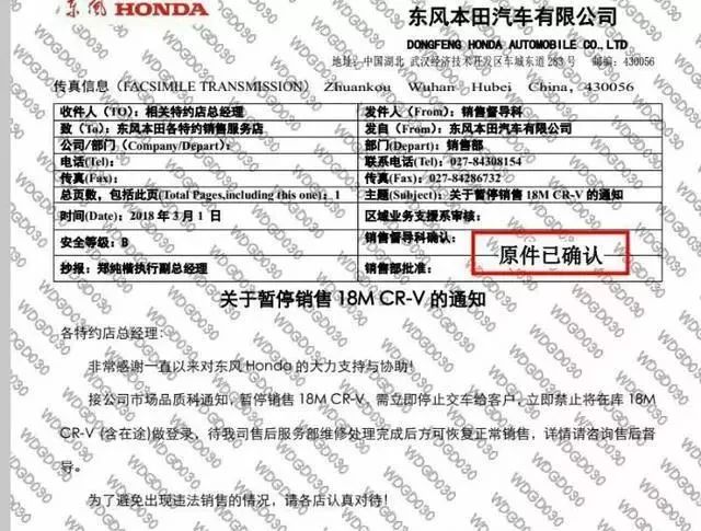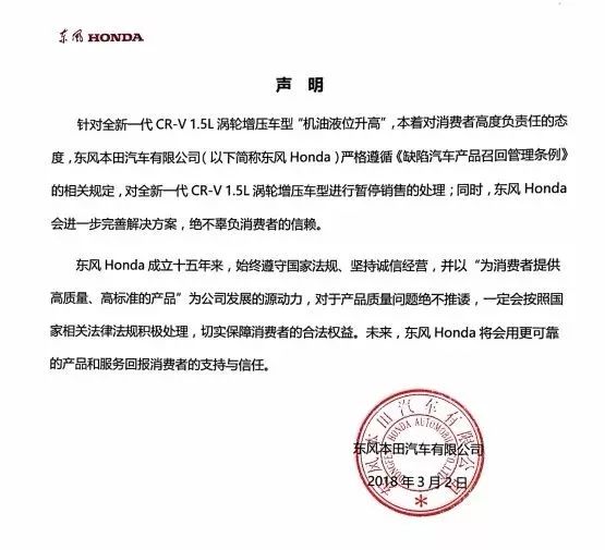 声明称:东风本田将严格遵循《缺陷汽车产品召回管理条例》的相关规定,对全新一代CR-V 1.5L涡轮增压车型进行暂停销售的处理;同时进一步完善解决方案,绝不辜负消费者的信赖。