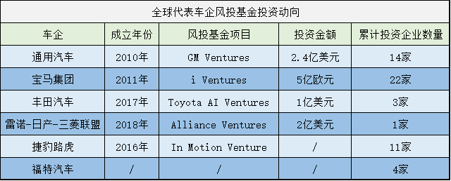 第二阶段则是车企通过风投基金运作,投资新兴科技公司并希望将最新技术得以运用来达到自身发展。类似车企有雷诺-日产-三菱联盟成立“Alliance Ventures”投资基金,通用和宝马汽车在2010年左右就先后投入资金成立了企业的专项投资基金,涉足AI、无人驾驶、共享出行和能源材料等初创行业。
