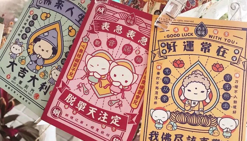 最近杭州一家寺庙居然因为“佛系周边”在社交网络上走红。杭州法喜寺是杭州著名古刹,也称“上天竺寺”,距今已经有一千多年的历史。没想到这么大岁数的寺庙也开始追赶年轻化浪潮,推出一系列把佛教、道教人物萌化的周边,包括帆布包、明信片、护身符、笔记本等等,一度卖到脱销。