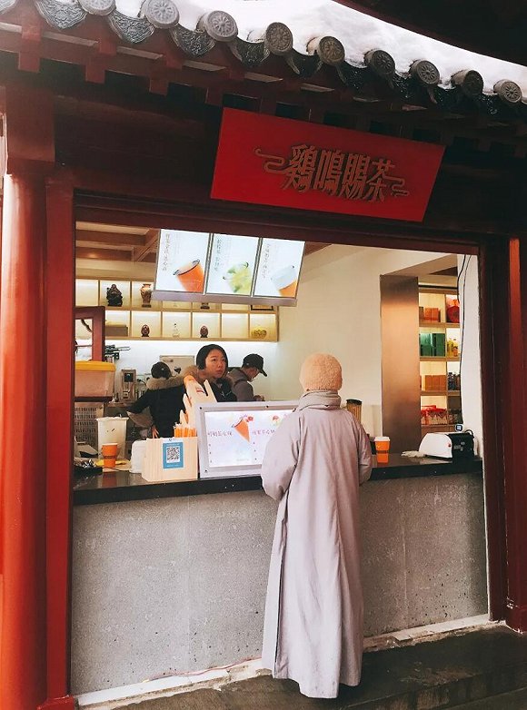 比如我们之前曾经报道过南京鸡鸣寺在售票处开了一家“鸡鸣赐茶”的奶茶店,从包装到每一款奶茶的名字都很佛系:抹茶拿铁叫醍醐饮,乌梅汁叫梅溪源,金研奶盖叫西江雪……酿制乌梅汁的乌梅还是僧人自己种的,可以说这种古意和网感的碰撞十分有反差感了。