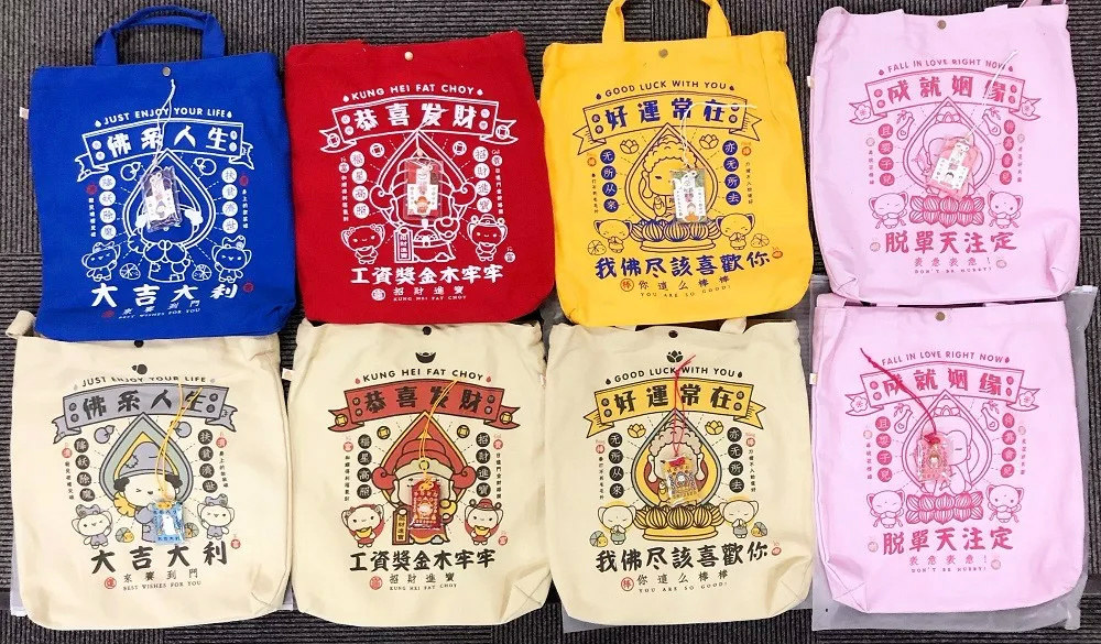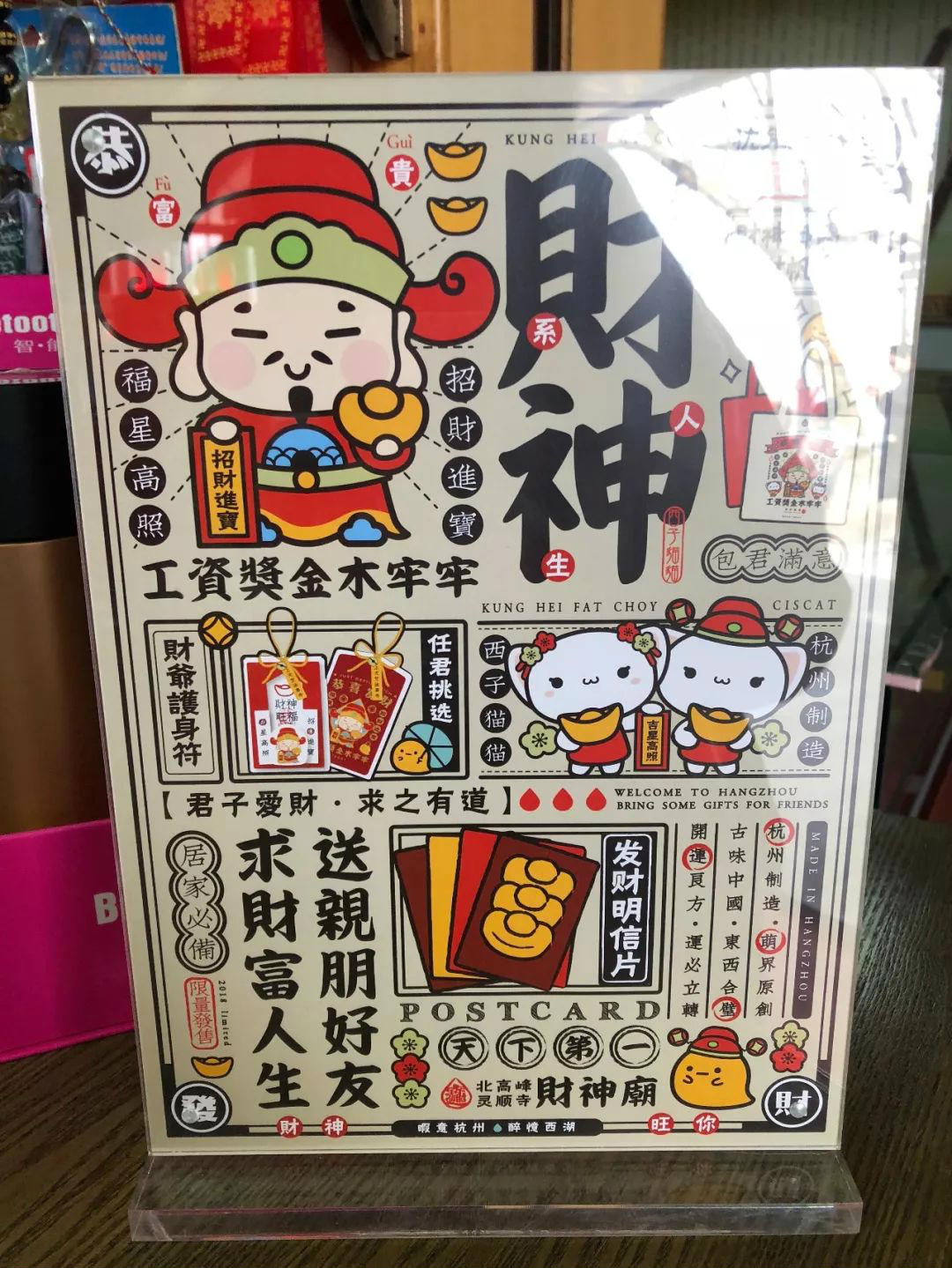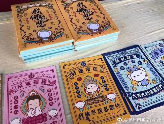 看看这些文案设计:“脱单天注定 表急啦”“工资奖金木牢牢(杭州方言,表示很多)”“佛系人生 大吉大利”“送亲朋好友 求财富人生”,加上卡通萌化的佛祖、观音、财神爷、济公的形象,这些有设计感的帆布包、护身符以及明信片,看上去比过去显得土气的纪念品有意思多了。
