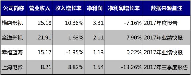 与横店影视同期登陆A股市场的金逸影视2017年快报中显示,营业收入较上年同期增长1.63%,净利润增长7.9%,仅达成个位数增长;另一家院线公司幸福蓝海营业收入较上年同期下降1.35%;净利润增长仅为0.22%。上海电影虽未公布2017年快报或年报,但从三季度来看,其净利润同比去年下降达13.26%,单凭Q4业绩很难力挽狂澜。