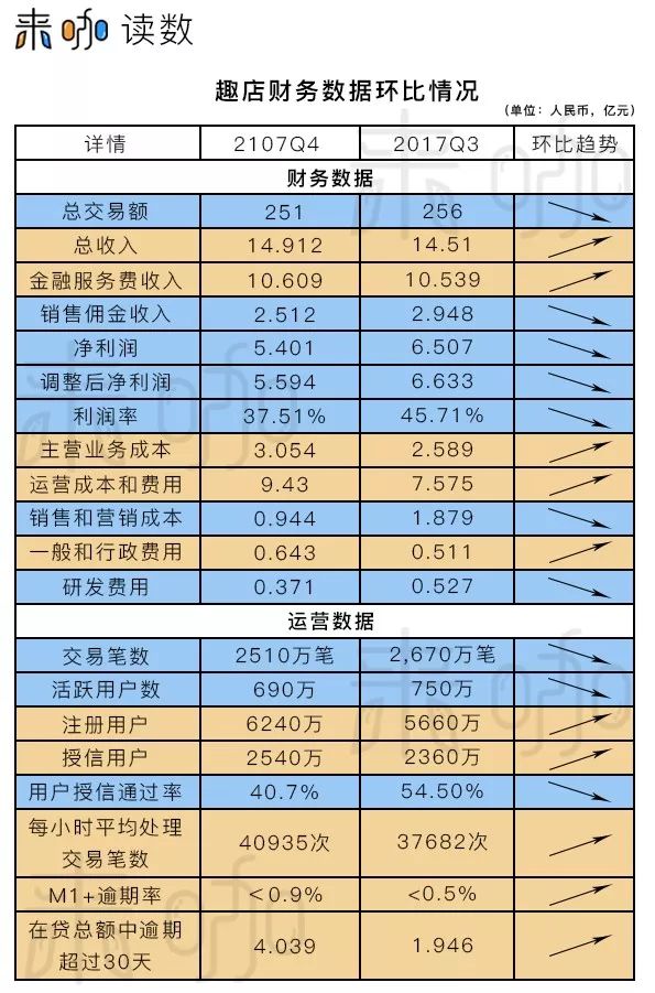 从另一个关键数据”活跃用户“可以看出,2017年第四季度,是趣店在完成转型后,首次出现活跃用户数下跌,结合第四季度理应是营业旺季的背景来看,这一趋势对趣店来说完全是灾难性的,这表明趣店在新用户的引入,以及老用户的留存方面都出现了问题。