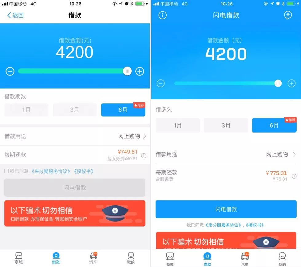 (左为支付宝窗口,右为来分期APP,二者每期还款相差25.5元)