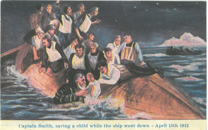 整个过程甚至以英国国教(Church of England)的圣歌作为背景音乐:船只沉没时,一个弦乐乐团在甲板上淡定地演奏《更近我主》(Nearer My God to Thee)。与此同时,报道还说人们最后一次看到因恪尽职守而与泰坦尼克号一同沉入大海的史密斯船长(Captain Smith)时,站在寒风中的他手里还抱着一名婴儿。后来,人们在纪念明信片上刻画了这样的场景:史密斯船长将一名婴儿交给坐在救生艇里的孩子母亲。