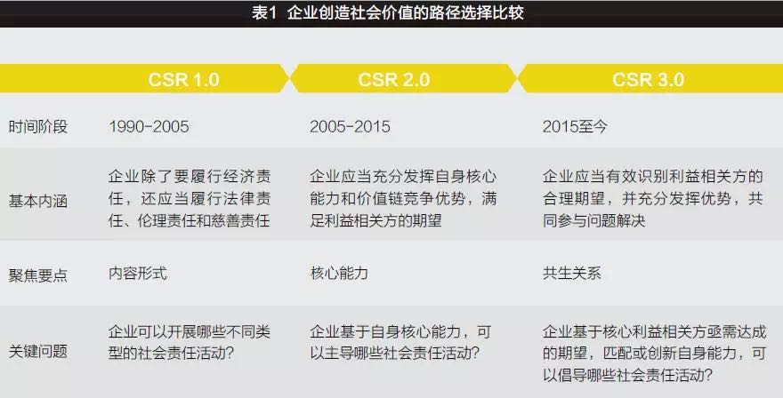 企业领导者秉持恰当的责任型发展战略观念,是企业实现商业和社会双重价值的重要基础。回顾当前企业关注社会问题,创造社会价值的主要实践路径,与企业社会责任(CSR)战略理论的演进历程相对应,大致可以划分为以下三种类型:
