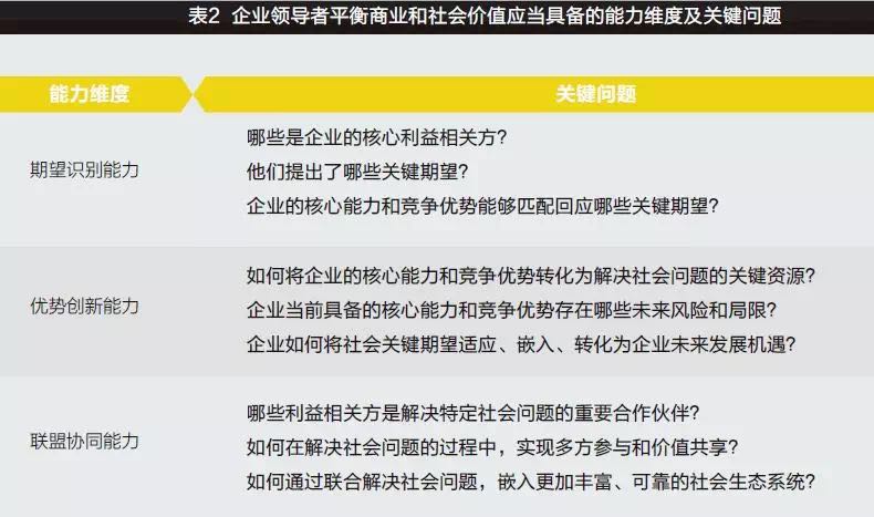 那么,如何平衡商业价值和社会价值?这需要把握三项关键领导能力,即期望识别能力、优势创新能力和联盟协同能力。