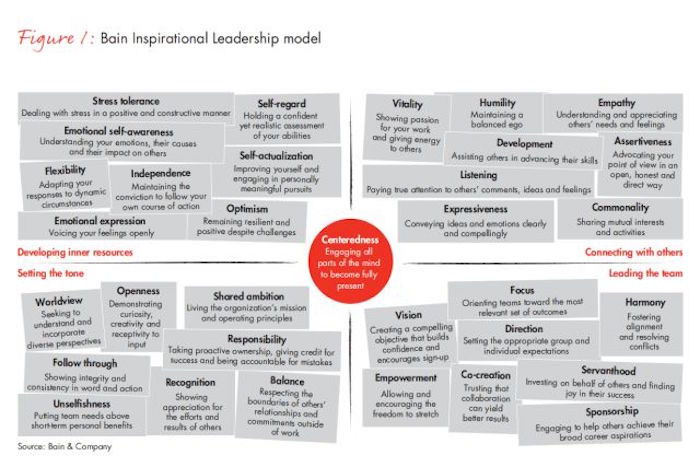 根据追随者的反应,我们进行了联合分析(典型的消费者研究),以评估一系列使受访者受到鼓舞的特质之间的相关性。其结果是33个特质鼓舞他人的效果在统计学意义上十分显著。 接着我们使用这套行为来创建“贝恩鼓舞型领导力模型”(如图1)。