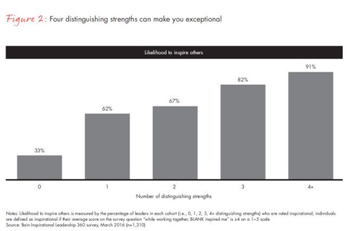一个人需要具备多少种如上的特质才能真正鼓舞他人?我们在超过10000项评估数据的数据库中,把个人的优势劣势与其同事所述的鼓舞程度联系了起来。