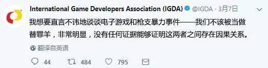 相比这些冷静的抗议者,另外一些人看起来则更激动。作为全球最大的非盈利游戏开发者协会,总部位于美国旧金山的IGDA连发7条推特试图告诉人们“电子游戏并非替罪羊”: