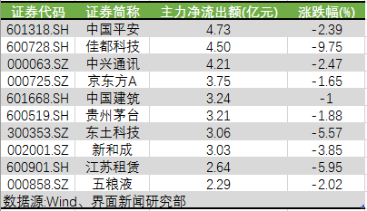 主力资金净流出额超1亿元的个股共有50只。中国平安(601318.SH)、佳都科技(600728.SH)、中兴通讯(000063.SZ)净流出额位居两市前三位,分别为4.73亿元、4.50亿元、4.21亿元。其中,佳都科技跌停。贵州茅台(600519.SH)、五粮液(000858.SZ)遭遇主力资金抛售,分别净流出3.21亿元、2.29亿元。工业互联网概念股东土科技(300353.SZ)主力资金净流出3.06亿元,股价下挫5.57%。