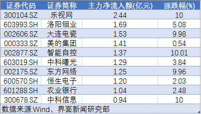 剔除尚未开板的新股,全天共计9只个股主力净流入额超1亿元。乐视网(300104.SZ)成为主力资金抢筹的焦点,全天获得净流入2.44亿元,早盘便逆市封板涨停。在乐视网涨停带领下,超跌股纷纷逆袭,大连电瓷(002606.SZ)今日净流入1.53亿元,并以涨停报收。智能自控(002877.SZ)今日再度封板,主力资金净流入1.37亿元。