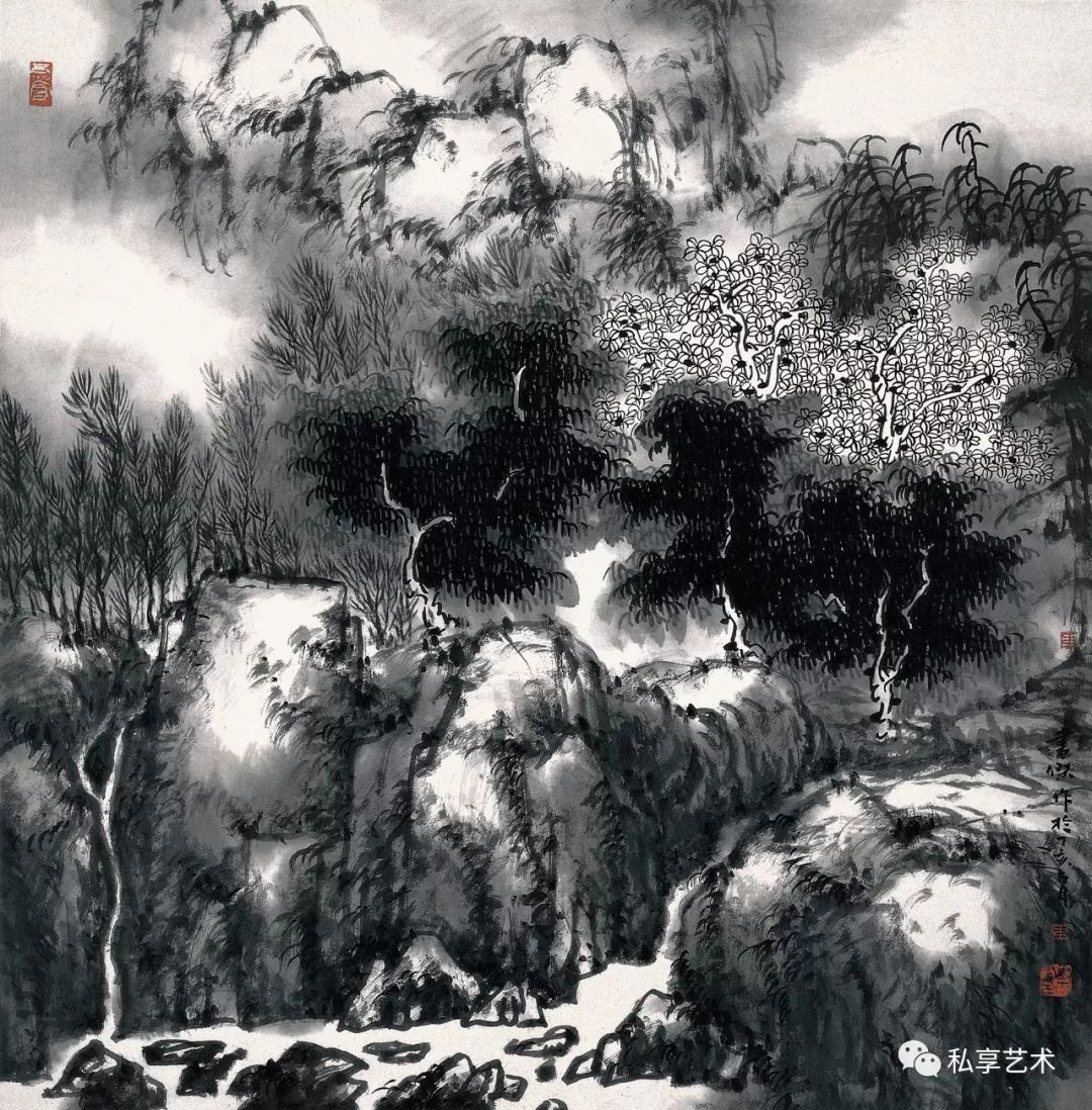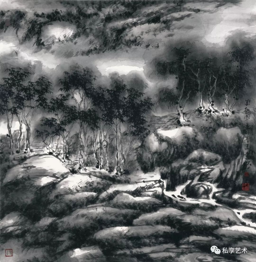 王书杰根据他对中国绘画史论和材料技法的透彻理解与熟练把握,在青绿山水和水墨山水的创作实践中突破了文人画的成见,汲取了文人画的精髓——笔墨韵味与写意精神。不论他的青绿山水还是水墨山水,都注重用笔的雅致,追求诗的意境。他的青绿山水赋色鲜丽,浓淡合宜,色即是墨,色彩富有墨韵;他的水墨山水元气淋漓,苍浑古秀,墨即是色,墨韵富有色彩。他在青绿山水和水墨山水两类绘画作品中的探索,都日益迫近「技进乎道,工而入逸」的终极目标。