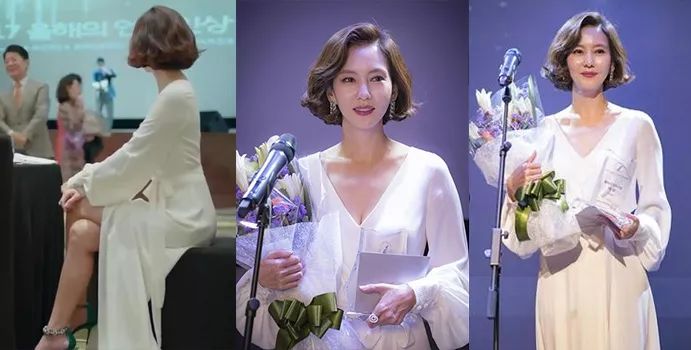 而参加重要场合也几乎都是连衣裙搞定所有!第一集领奖,一条白色开衩裹身裙,搭配绿色高跟鞋和耳环,走“老娘不争不抢、该是我”的清新女神路线。