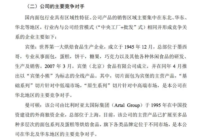 看到这里,小食代要回头说说咱们一开头的那句话。原来,早在2015年沈阳烘焙食品生产商桃李面包(603866)上市时,就曾经在其招股书里指出,自己在中国市场的主要竞争对手,就是它们两家,如下图所示: