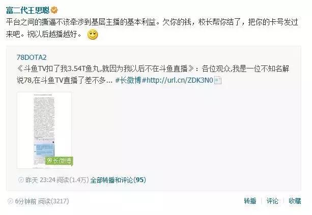 此外,他还在微博上贴出,当有主播公开斗鱼欠薪的事情时,他为斗鱼主播支付工资的事情。“平台之间的争斗不应该影响基层主播的利益,欠你多少工资王校长给了,愿你走好。”