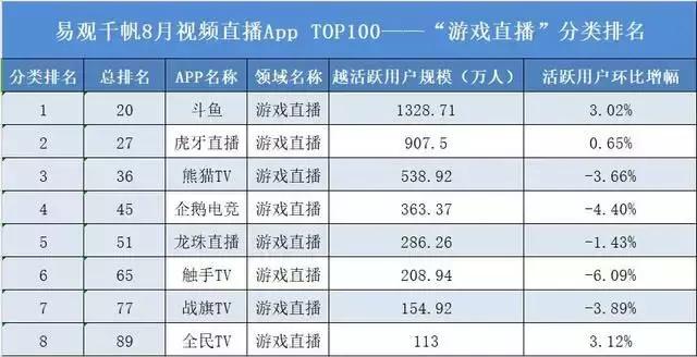 根据易观千帆2017年9月发布的“视频直播排行”数据 ,斗鱼直播排名已经进入前20,APP用户达到1328.71万人,第二名虎牙421万人。除此之外,腾讯旗下还有企鹅电竞和NOW直播,前者活跃用户达363万,仅次于熊猫TV。