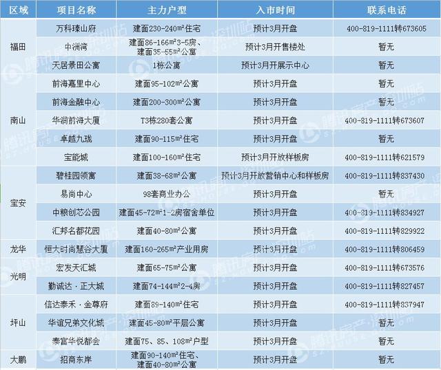 另外,据腾讯房产不完全统计,在接下来的3月份,深圳预计有19个项目入市,其中有15个项目开盘,4个项目开放营销中心或样板房;从区域分布来看,南山有5个项目,宝安有4个项目,福田和光明分别有3个项目,光明有2个项目,龙华和大鹏分别仅1个项目。深圳楼市3月或将迎来“小阳春”。