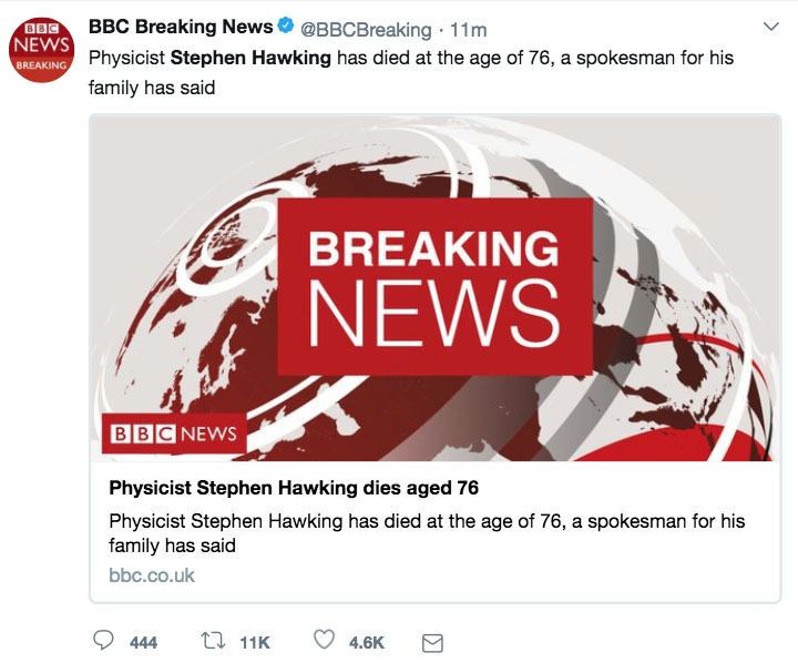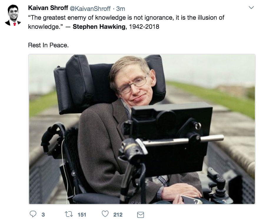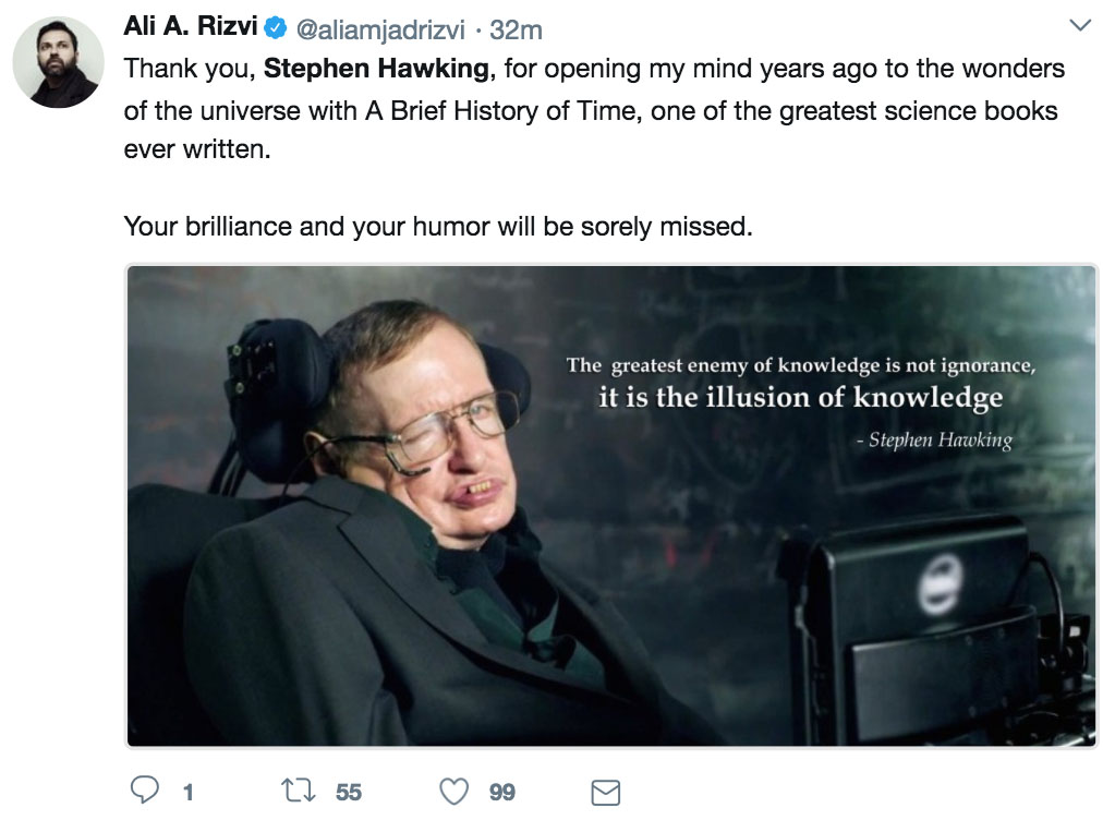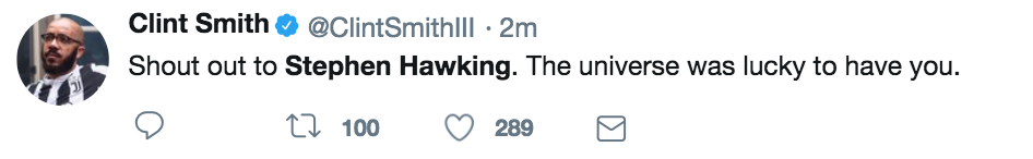 推特网友们自发在#Stephen Hawking这一标签下表达对他的缅怀: