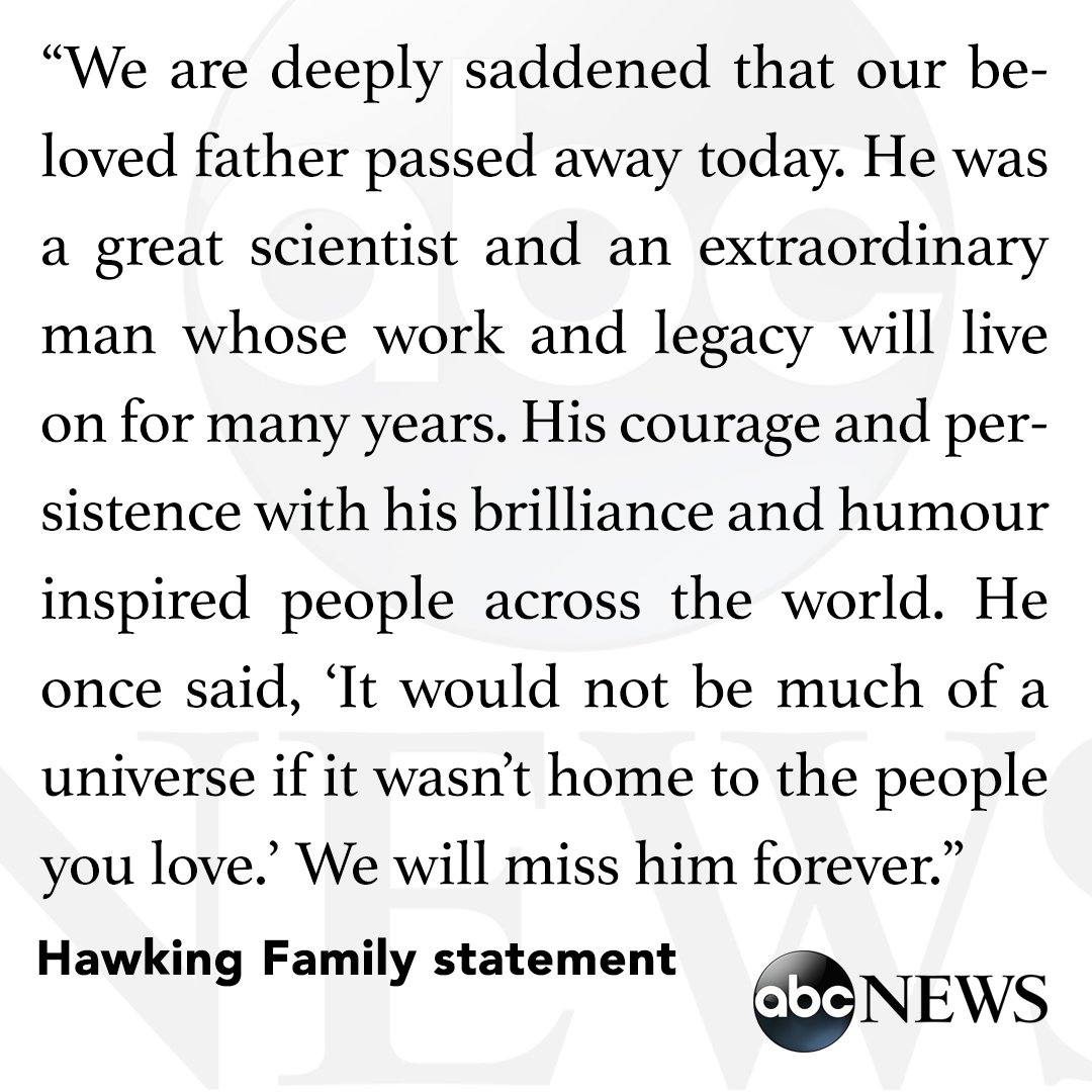 “我们挚爱的父亲的逝世留给我们深切的悲痛。他不仅是一位伟大的物理学家,也是伟大的人,他的作品和遗产将会长存。他的勇气、坚持不懈的意志,连同他的智慧和幽默曾鼓舞过世界每一个角落的人。他曾说过:‘如果其间没有你所爱的人,宇宙就不足以为宇宙。’我们会永远怀念他。”