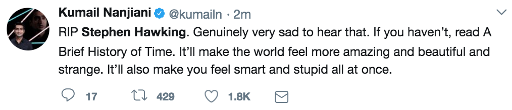 安息吧史蒂芬•霍金。听到这个消息我真的很难过。如果你还没有读过《时间简史》。这是一本让世界变得越发惊人、迷人和神奇的作品,它会让你同时认识到自己的聪明和愚笨。