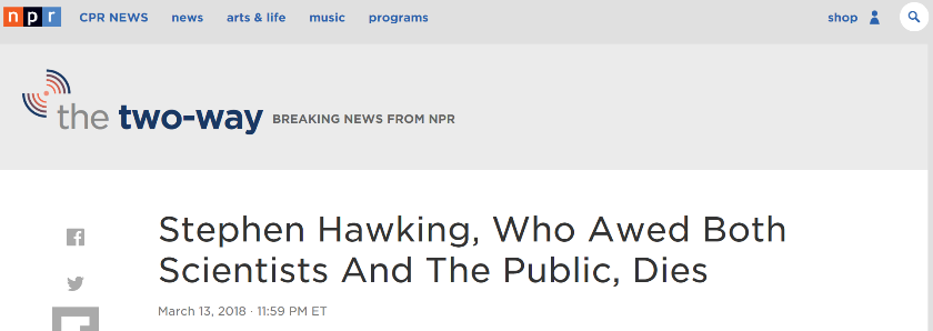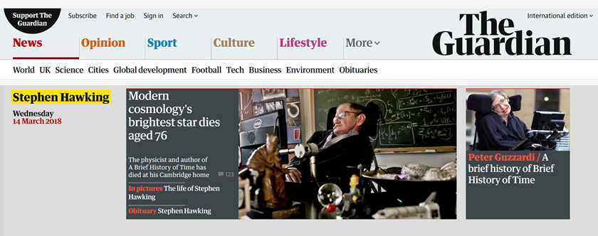 《卫报》发表的讣告说,在提升大家对科学的兴趣之外,霍金也关注社会问题,“有时他会展现出前沿科学家的傲慢”,但他更经常展现的是“真正的人性”。