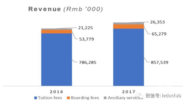 从公司营收构成来看,学费收入依然是当之无愧的主力,2017年学费总收入为8.58亿元,占总收入的90%以上,与去年相比,学费上涨9.1%。住宿费比上年增长21.4%,2017年贡献6.9%,基本与2016年持平(6.2%)。配套服务收入为2635千万元,较2016年增涨24.2%,占2017年总收入的2.8%,2016年为2.5%。