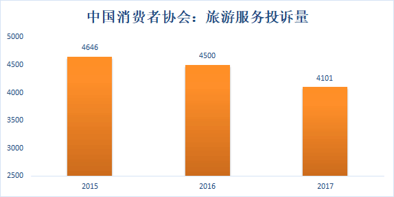 根据中国消费者协会公布的数据,2015年收到关于旅游服务的投诉为4646件,2016年为4500件,2017年为4101件,旅游服务的投诉量也呈现出下降趋势。