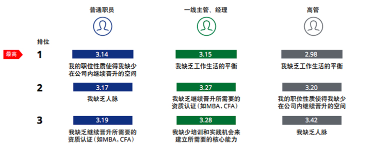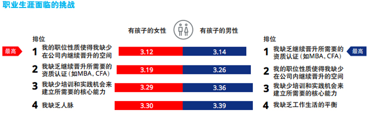 对于女性而言,婚后、育后所面对的最大困难是缺乏晋升空间。这可能表现为“对母性的偏见”——这与对母亲身份的设想有关,母亲通常被认为难以胜任且无法全身心投入她们的工作。因而调查显示,职场对她们的要求更高,而她们能得到的机会却更少。这种潜意识的偏见导致公司的管理者即使对工作中的母亲是怀有善意的,但实际上却很有可能会通过把她们排除在需要长时间工作或出差的任务和项目之外,而无意中固化这样的性别角色。研究表明,男性和女性间的薪资水平差异越来越多地归因于生育造成的职业中断。当女性晋升到更高的职位后,工作与生活失衡就变成了更普遍的问题。和公司中同级别的男性相比,她们认为这一挑战更加严峻。