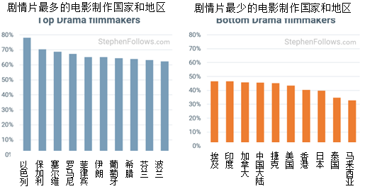 其他制作剧情片最多的国家包括保加利亚(70%的电影都是剧情片)、塞尔维亚(69%)和罗马尼亚(67%)。在前50位电影大国中,剧情片数量最少的国家是马来西亚,只有32%的影片是剧情片。