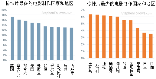 日本和伊朗所制作的惊悚片所占份额最小,分别不到4%。