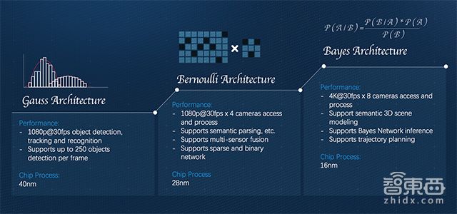 黄畅在GTIC现场讲到,如果按照智能决策处理顺序,AI可以分成感知、建模、决策和规划三个阶段,基于这种分类,地平线也对应规划了名为高斯、伯努利和贝叶斯的三代BPU(Brain Processing Unit, 地平线自主设计研发的高效的人工智能处理器架构)架构。