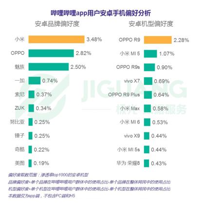 也有人会反驳这种只是基数大,实际的用户转化率不高,作为营销增长点相对乏力。但是根据极光大数据发布的《2017年7月哔哩哔哩app研究报告》数据显示,与雷军绑定的小米,恰恰是哔哩哔哩APP用户最喜爱的安卓手机。