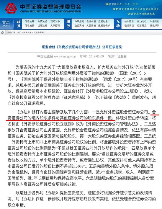 上周五(3月9日),证监会就《外商投资证券公司管理办法》公开征求意见,其中“合资证券公司的境内股东条件与其他证券公司的股东条件一致”的关键表述,被放开外资控股和业务范围所掩盖。