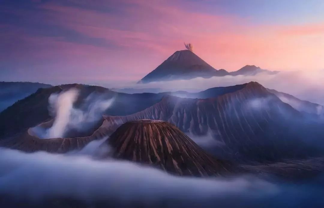布罗莫火山位于印度尼西亚爪哇岛东部,是一座活火山,有着如月球表面般令人生畏的地貌,是印尼最为壮观的风景之一。这里每天依旧冒着白烟,这片荒无人烟的地带给人以世界尽头的感觉,尤其是在日出之时。