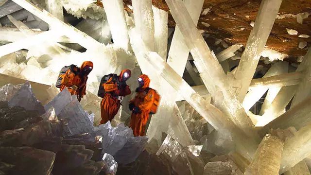 墨西哥巨型水晶洞,位于地下290米深处。洞内到处都是壮观的发光巨型石柱,直径4英尺,长度达到50英尺。洞内的巨型石膏晶体在数十万年时间里,一直以极其缓慢的速度生长着。含矿物成分的高温水冷却过程中,因石膏饱和而结晶析出。