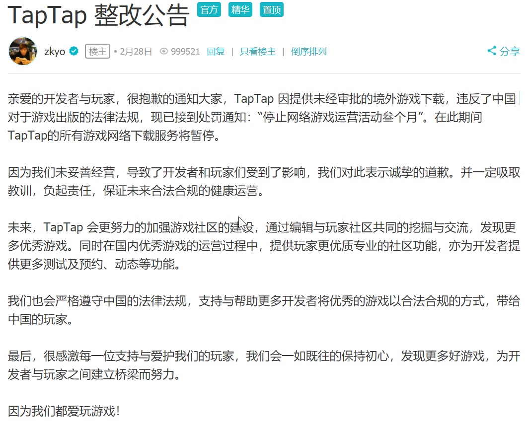 在公告中,TapTap公开道歉,并表示未来“会严格遵守中国的法律法规,支持与帮助更多开发者将优秀的游戏以合法合规的方式,带给中国的玩家”。