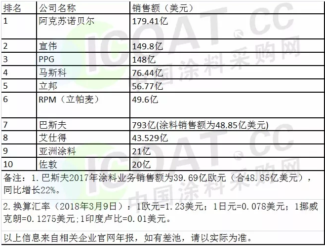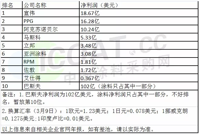 截止目前,全球十大涂料企业纷纷发布了2017年年报,根据年报,我们可以看出阿克苏诺贝尔2017年以销售额179.41亿美元居第一位,宣伟以149.8亿美元居第二位,PPG以148亿美元居第三位。佐敦以20亿排名第10。从净利润来看,宣伟以净利润18.67亿美元居第一,PPG以16.28亿美元居第二,阿克苏诺贝尔以10.24亿美元居第三。利润最少的是艾仕得涂料,仅0.36亿美元。