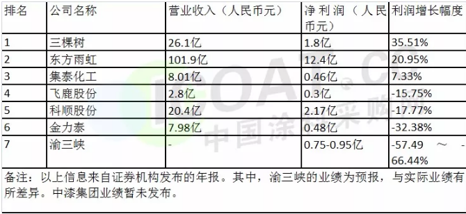 国内方面,2017年在政策和市场环境的影响下,整个涂料产业链条上的上下游企业都受到了极大的影响。从多家涂料企业发布数据来看,2017年受原材料价格大幅上涨的影响,处于产业链下游的涂料企业盈利能力较弱,其中渝三峡、科顺股份、飞鹿股份、金力泰纷纷出现了利润大幅下降,仅三棵树、东方雨虹、集泰化工获得小幅上涨利润。