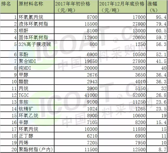 众所周知,原材料价格波动,严厉的环保政策,是影响涂料市场的一个主要因素,这种情况在中国表现较为明显。涂料的原材料种类很多,大致可以分为树脂、乳液、颜填料、助剂、溶剂几大类别,每种类别里又包括了很多种类。其中,主要的树脂有聚氨酯、环氧树脂等;颜料分为有机颜料和无机颜料,无机颜料主要有钛白粉、氧化铁等。2017年,在供给侧改革和环保政策下环氧氯丙烷、环氧树脂、MDI等涂料原材料涨幅较大,使涂料行业大大提高了生产成本,挤压了涂料行业的利润。