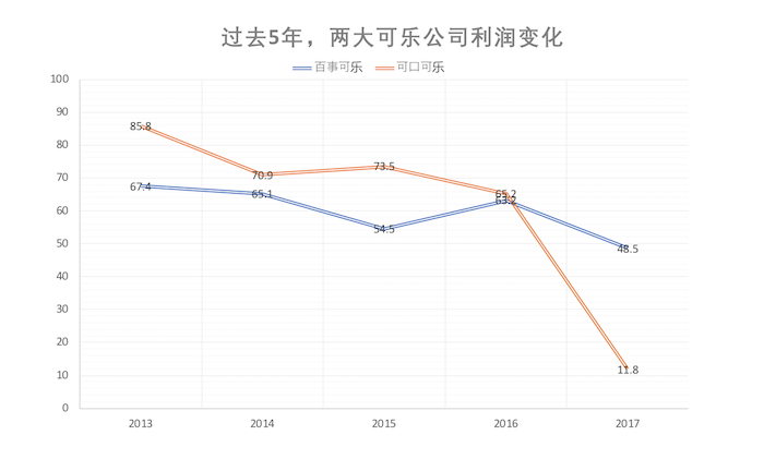 直到2017年结束,碳酸饮料下滑的颓势依然没能得到遏止。截止2017年12月31日,可口可乐公司的净利润为11.8亿美元,同比减少了81%;百事可乐的净利润达到48.5亿美元,也比上一年少赚了23%。