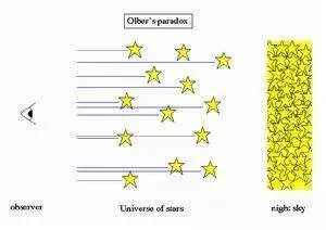 设想一下,广袤宇宙无数恒星,站在地球上往任何方向看,视线所及之处必然有很多星星,打个比方,就如同天上布满了或远或近的灯泡,这样的夜空难道不应该全亮吗?