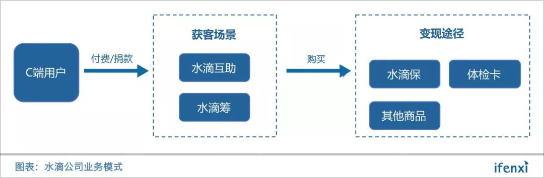 水滴互助、水滴筹承担了前端获客的功能,本身并不担负变现职责。其中水滴互助本身筛选出来的是关注健康保障的群体,水滴筹用户在捐款过程中很容易触动风险意识,均是健康险变现的极好场景。