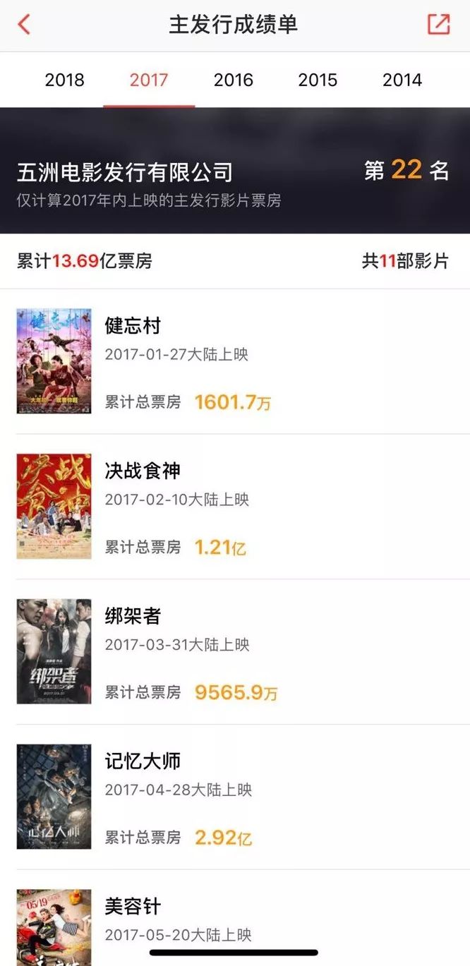 但猫眼专业版显示,万达影视2016年主出品的电影总票房只有18亿,位列所有公司第20位;五洲发行主发行的影片票房不到10亿,排名第12位。