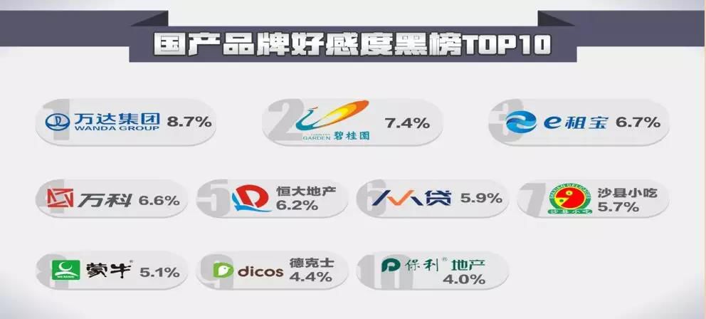 在国产品牌的黑榜上,万达排第一,碧桂园、e租宝和万科分别位居第二、三、四位。排名第五至第十位的国产品牌依次为恒大地产、人人贷、沙县小吃、蒙牛、德克士、保利地产。
