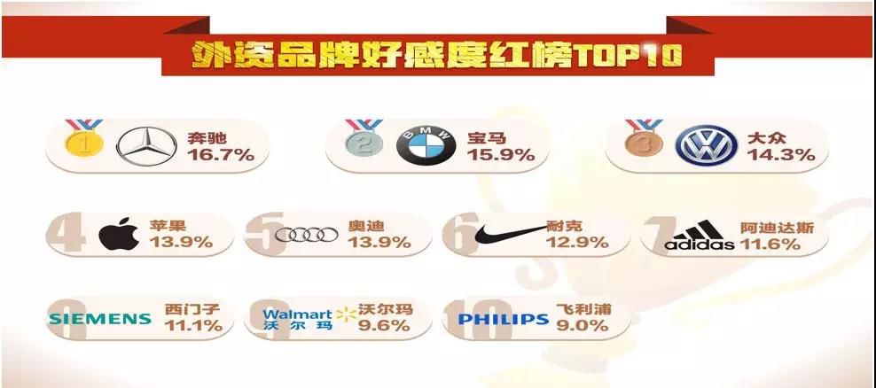再来看看外资品牌的红榜:奔驰位居第一,宝马排第二。之后依次是大众、苹果、奥迪、耐克NIKE、Adidas阿迪达斯、西门子、沃尔玛和飞利浦。