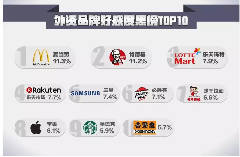 外资品牌的黑榜结果是这样的,麦当劳被评为国人最不喜欢的外资品牌,肯德基排第二,乐天玛特是第三。之后的企业排名依次是乐天市场、三星、必胜客、味千拉面、苹果、星巴克和吉野家。
