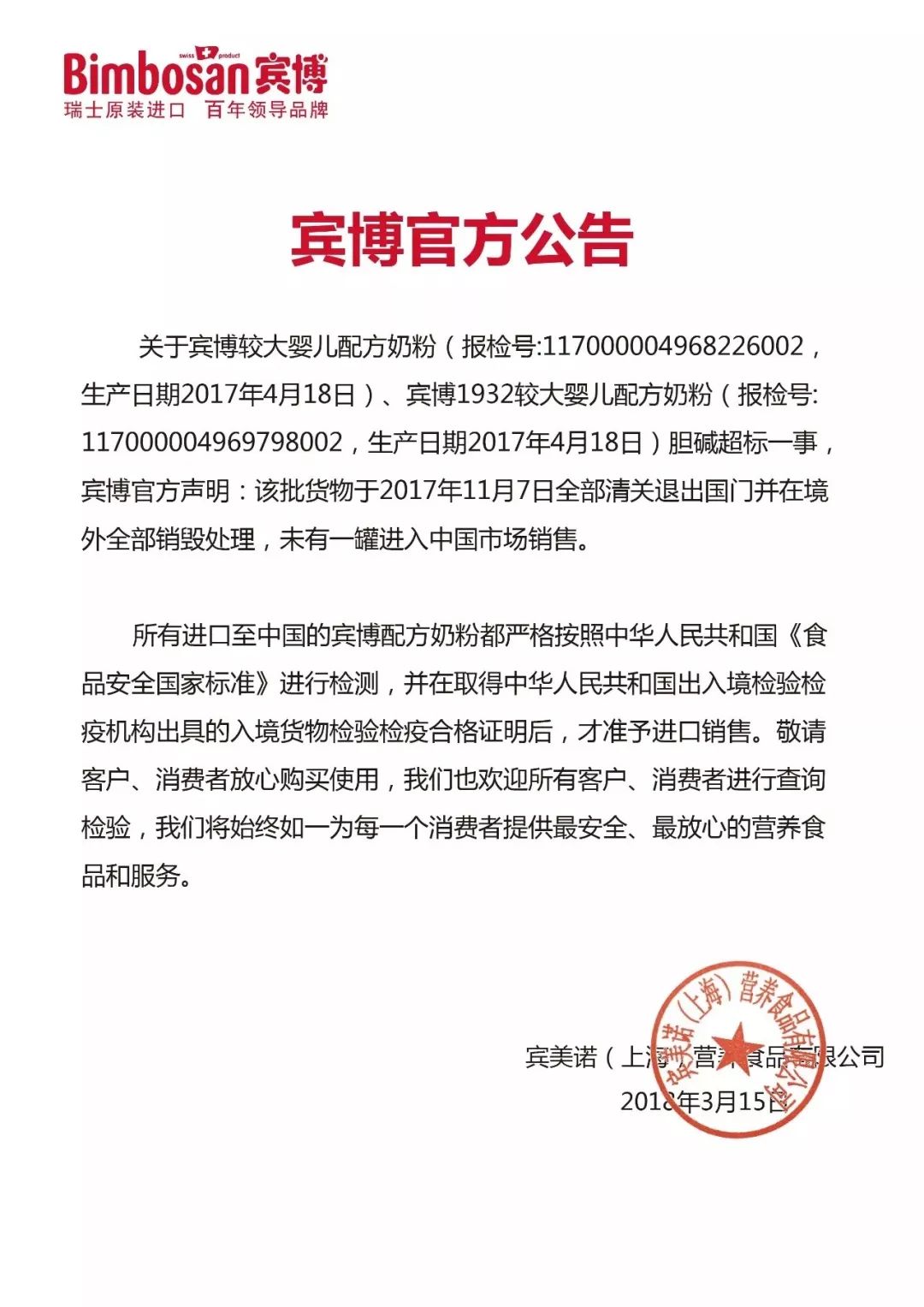 在宾博中国区总负责人给小食代发来官方公告中,声明宾博较大婴儿配方奶粉和宾博1932较大婴儿配方奶粉都是胆碱超标,生产日期均是2017年4月18日。该货物是在2017年11月全部清关退出国门并在境外全部销毁处理,未有一罐进入中国市场销售。
